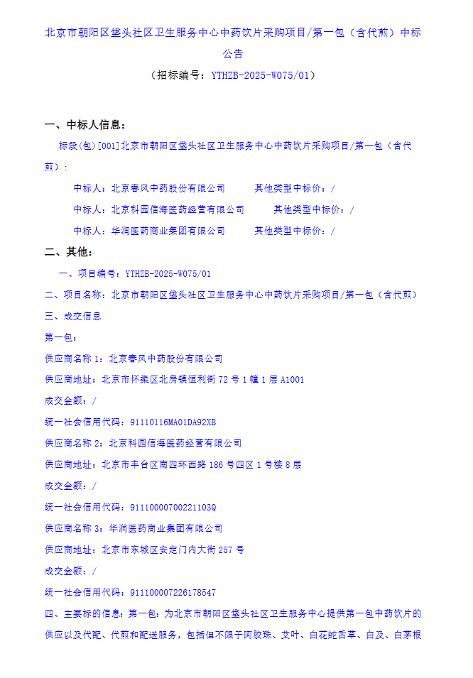 【北京市朝阳区垡头社区卫生服务中心】北京市朝阳区垡头社区卫生服务中心中药饮片采购项目/第一包(含代煎)中标公告