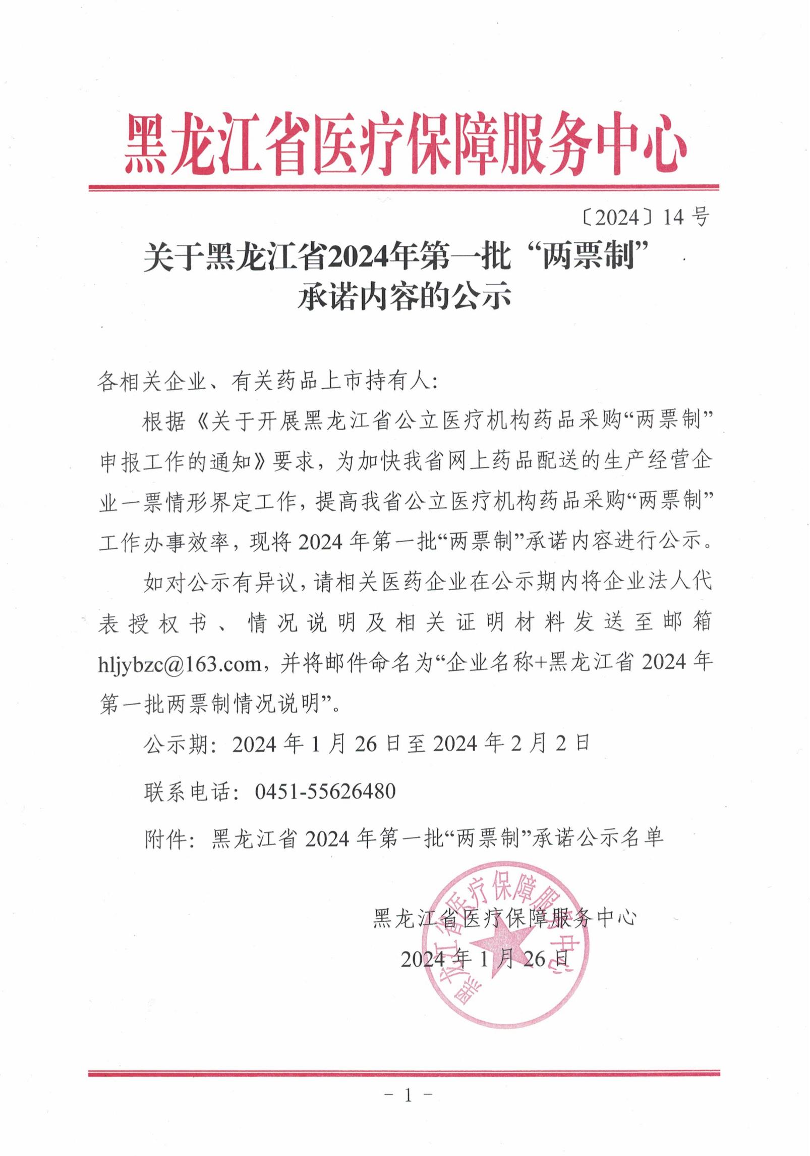 根据《关于开展黑龙江省公立医疗机构药品采购“两票制”申报工作的通知》要求,为加快我省网上药品配送的生产经营企业一票情形界定工作,提高我省公立医疗机构药品采购“两票制”工作办事效率,现将2024年第一批“两票制”承诺内容进行公示。