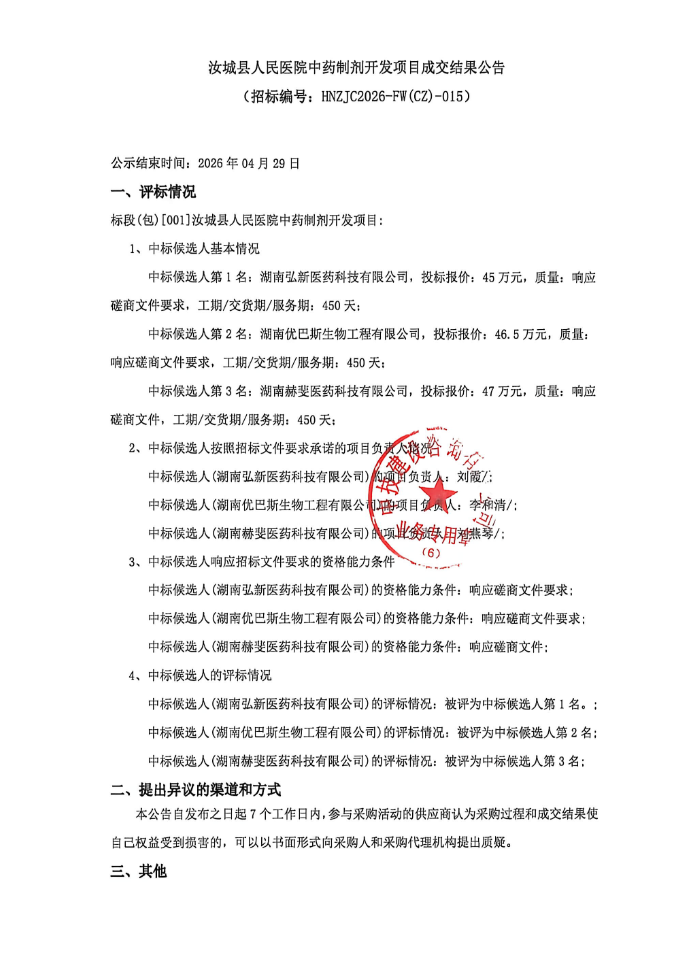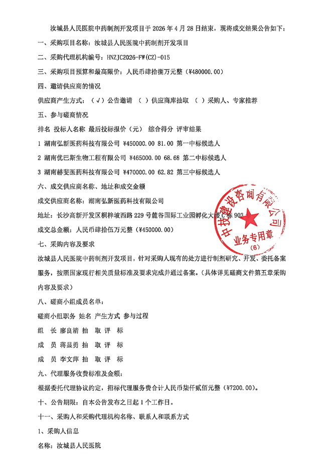 【郴州市汝城县人民医院】湖南省郴州市汝城县人民医院中药制剂开发项目成交结果公告