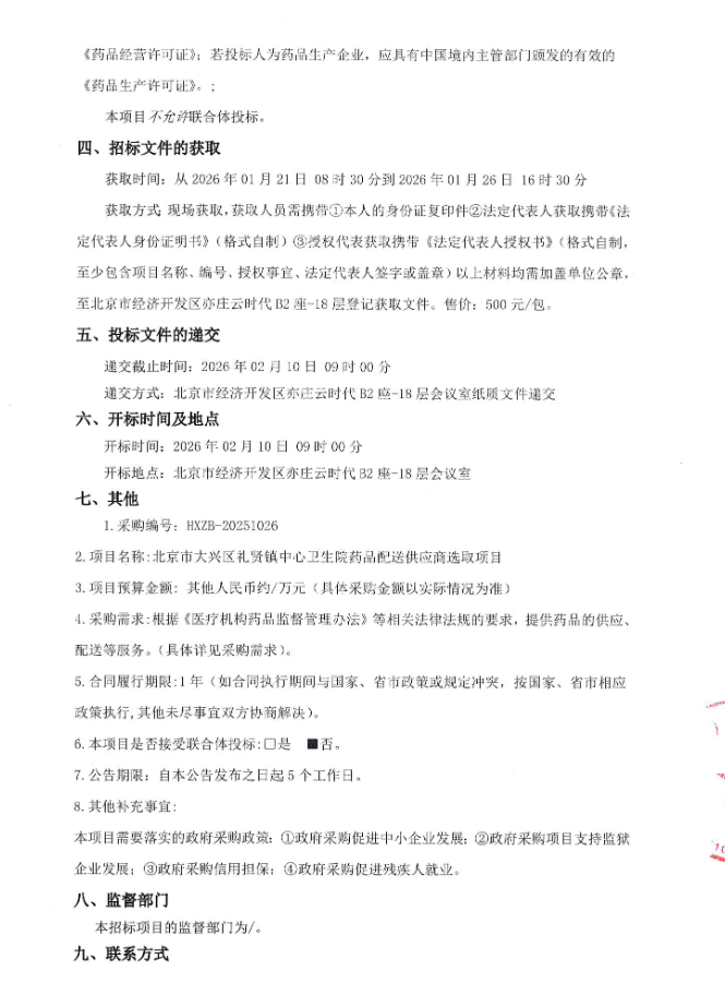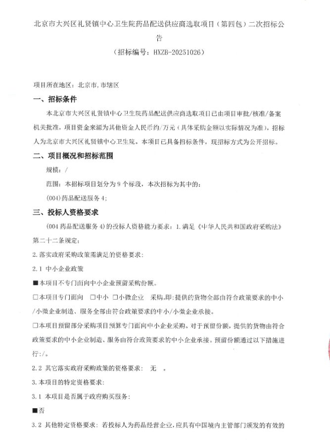 【北京市大兴区礼贤镇中心卫生院】北京市大兴区礼贤镇中心卫生院药品配送供应商选取项目(第四包)二次招标公告