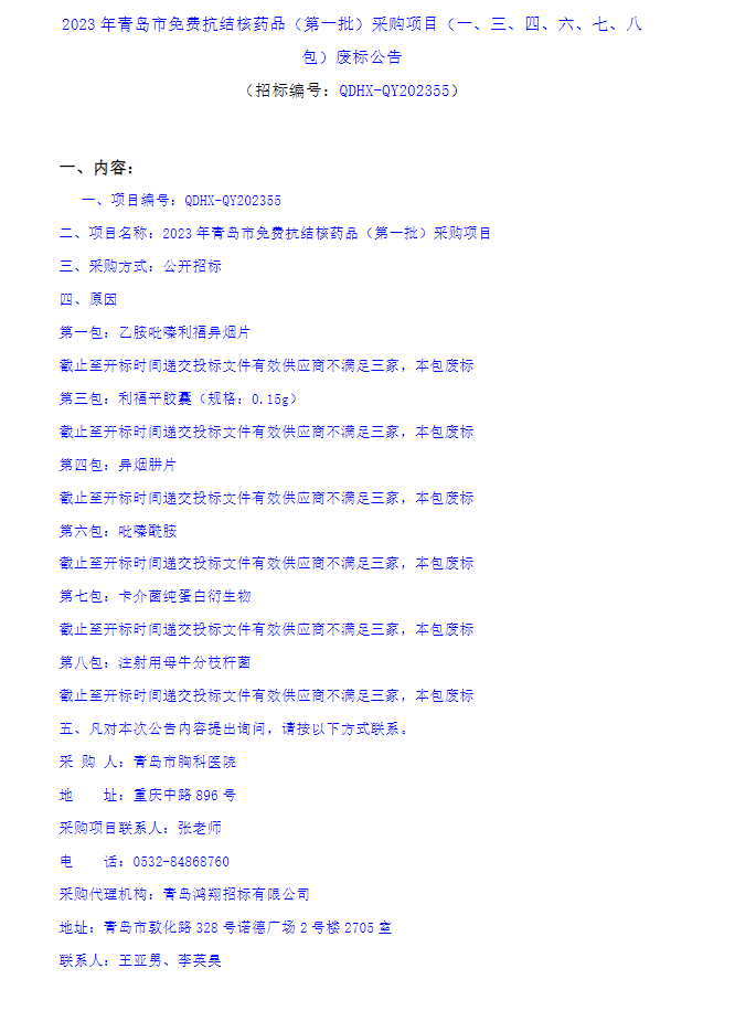 【青岛市胸科医院】山东省2023年青岛市免费抗结核药品(第一批)采购项目(一、三、四、六、七、八包)废标公告
