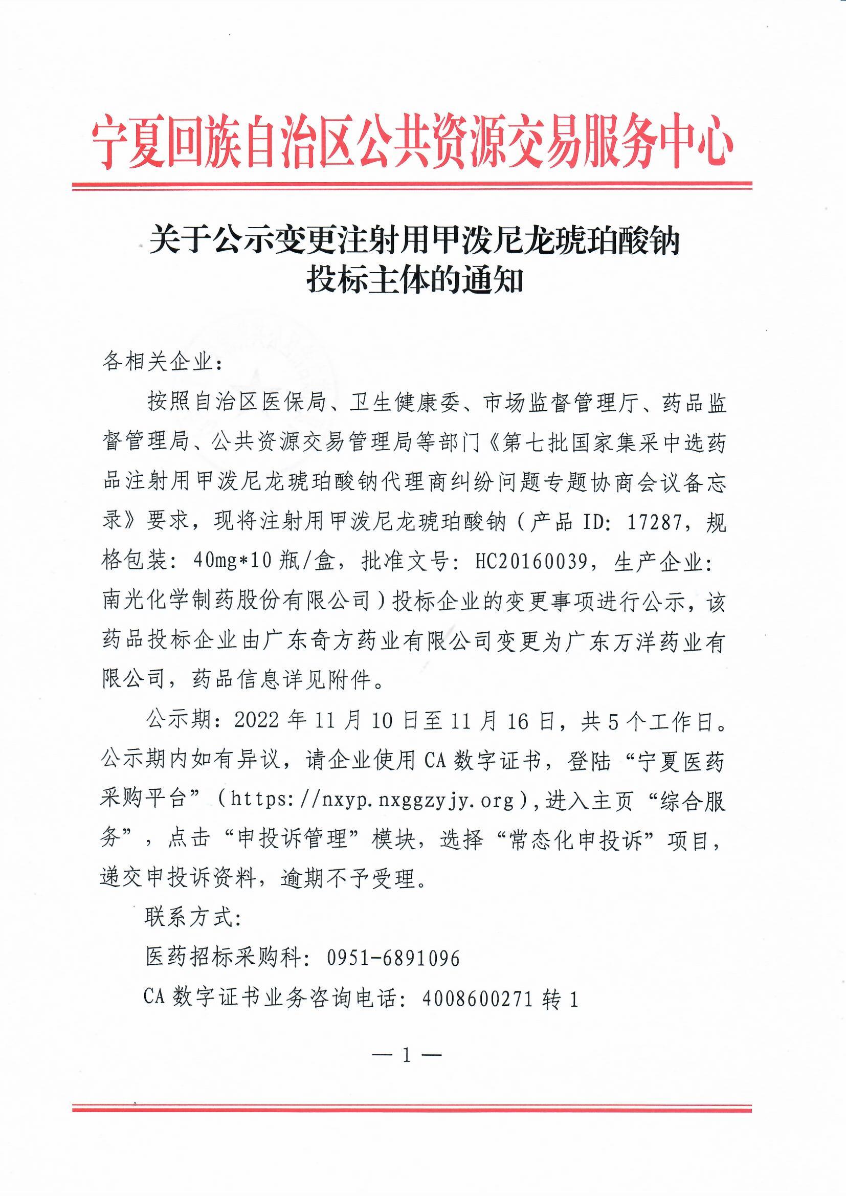 宁夏回族自治区公共资源交易服务中心关于公示变更注射用甲泼尼龙琥珀酸钠投标主体的通知