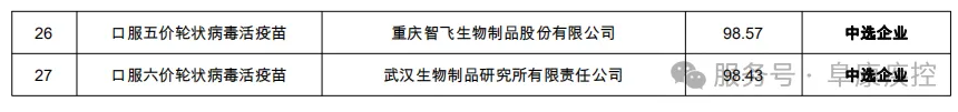 每种疫苗遴选1家生产企业,2家备选生产企业,所有得分按由高到低入选,如遇分数相同,则去掉一个最高分、去掉一个最低分,按剩余打分总分评判,由高到低。