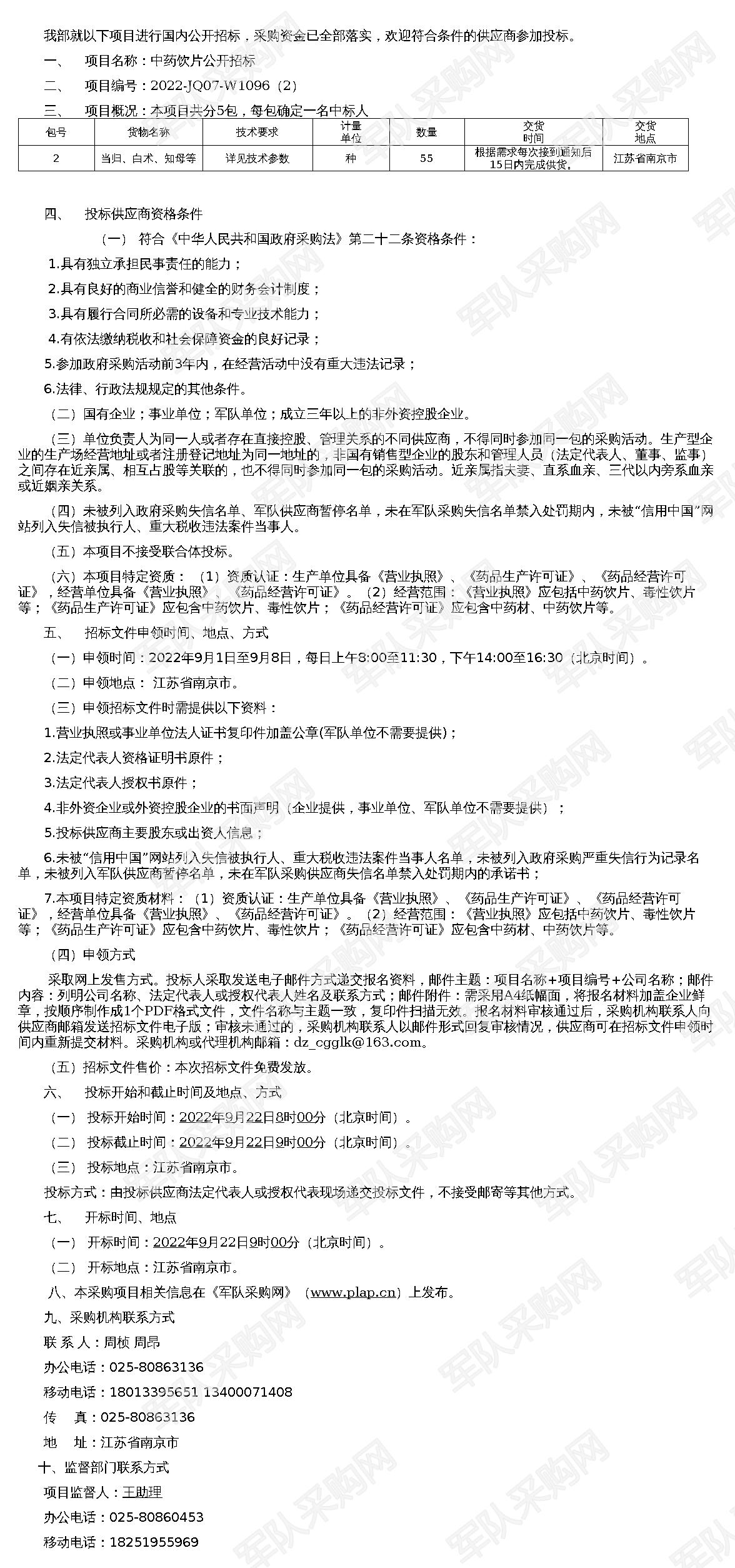 【军队采购网】中药饮片公开招标公告(2022-JQ07-W1096(2))
