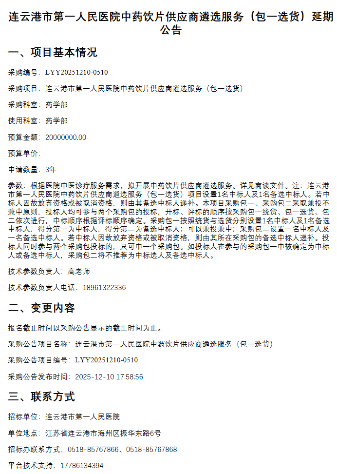 【连云港市第一人民医院】江苏省连云港市第一人民医院中药饮片供应商遴选服务(包一选货)延期公告