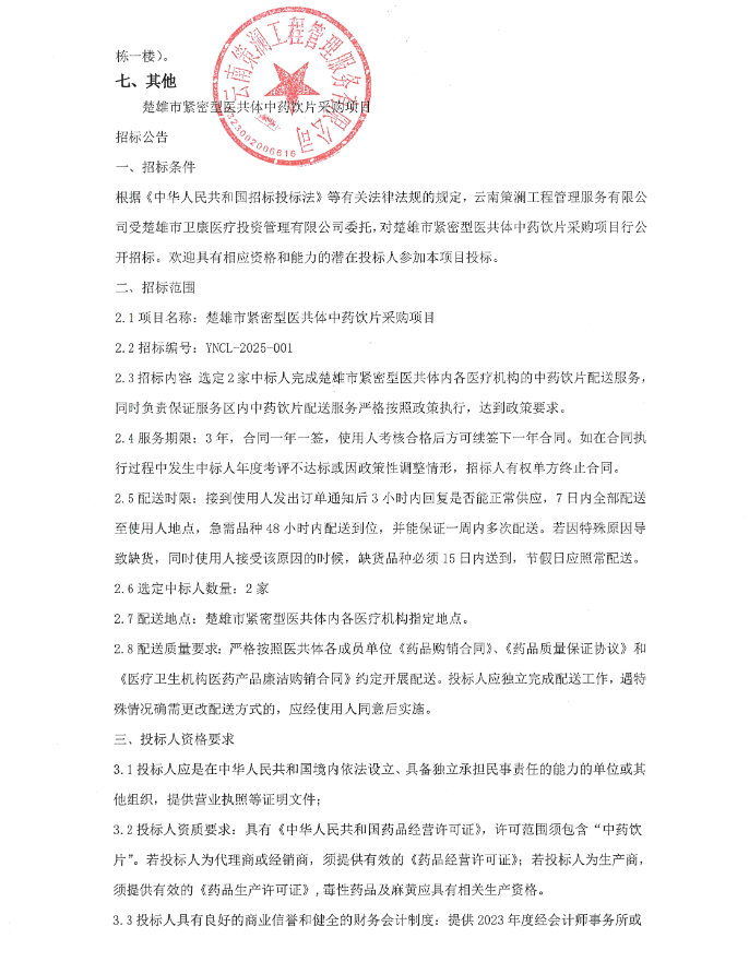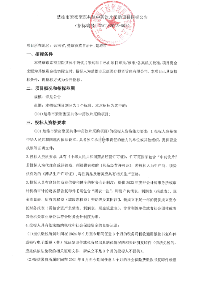 【楚雄彝族自治州楚雄市中医医院】云南省楚雄市紧密型医共体中药饮片采购项目招标公告