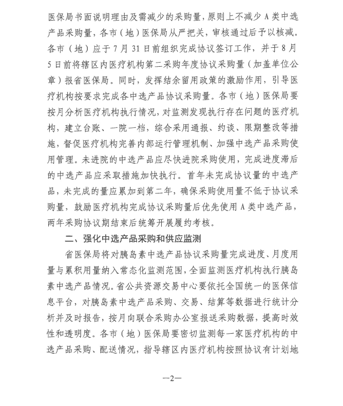 各市(地)医保局要组织辖区内医疗机构做好胰岛素集采第二年度采购协议签订工作,原则上以本医疗机构上一年度协议采购量续签协议,协议签订时间为2023年5月20日至2024年5月19日。如医疗机构因特殊原因需减少采购量,须向各市(地)医保局书面说明理由及需减少的采购量,原则上不减少A类中选产品采购量,各市(地)医保局从严把关,审核通过后予以核减。各市(地)应于7月31日前组织完成协议签订工作,并于8月5日前将辖区内医疗机构第二采购年度协议采购量(加盖单位公章)报省医保局。同时,发挥结余留用政策的激励作用,引导医疗机构按要求完成各中选产品协议采购量。各市(地)医保局要按月分析医疗机构执行情况,对监测发现执行存在问题的医疗机构,建立台账、一院一档,综合采用通报、约谈、限期整改等措施,督促医疗机构完善内部运行管理机制、加强中选产品采购使用管理。未进院的中选产品应尽快进院采购使用,完成进度滞后的中选产品应采取措施加快执行。首年未完成协议量的中选产品,未完成的量应累加到第二年,确保采购使用量不低于协议采购量,鼓励医疗机构完成协议采购量后优先使用A类中选产品,两年采购协议期结束后统筹开展履约考核。