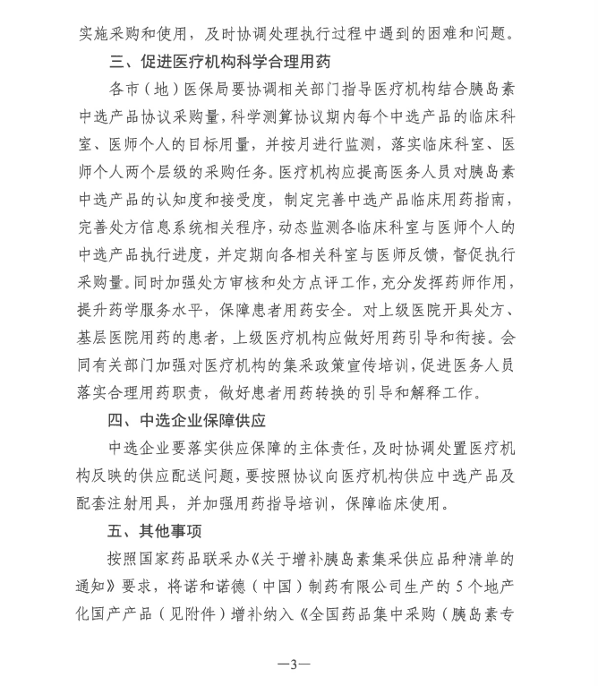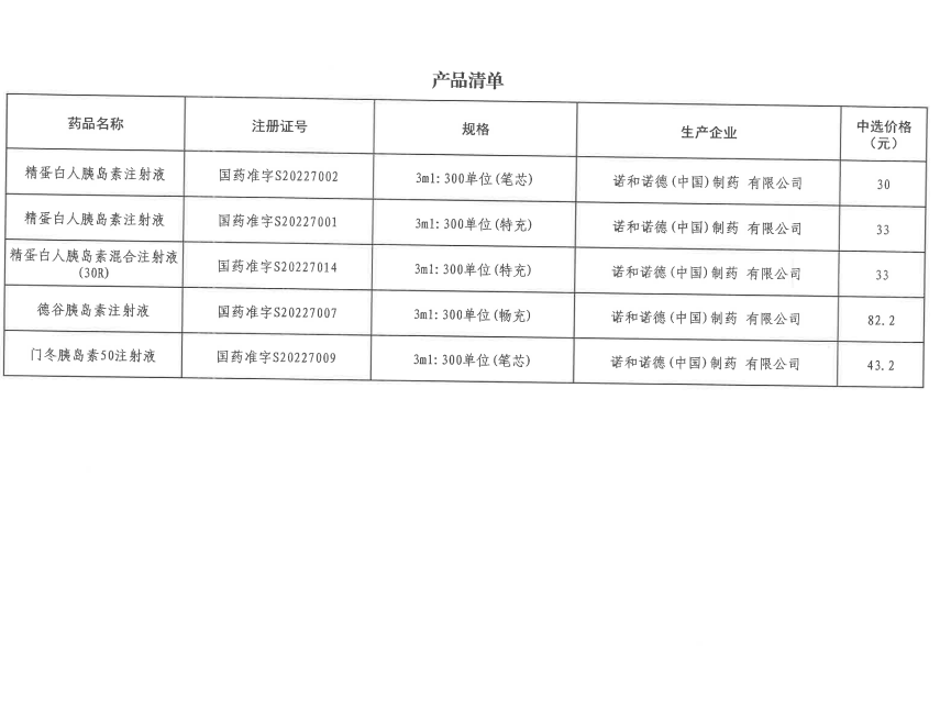 按照国家药品联采办《关于增补胰岛素集采供应品种清单的通知》要求,将诺和诺德(中国)制药有限公司生产的5个地产化国产产品(见附件)增补纳入《全国药品集中采购(胰岛素专项)中选后供应品种清单》,省公共资源交易中心应及时予以挂网,方便医疗机构采购中选药品。