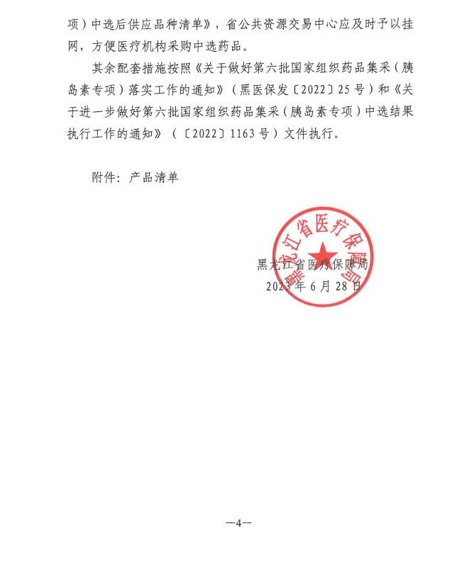其余配套措施按照《关于做好第六批国家组织药品集采(胰岛素专项)落实工作的通知》(黑医保发〔2022〕25号)和《关于进一步做好第六批国家组织药品集采(胰岛素专项)中选结果执行工作的通知》(〔2022〕1163号)文件执行。