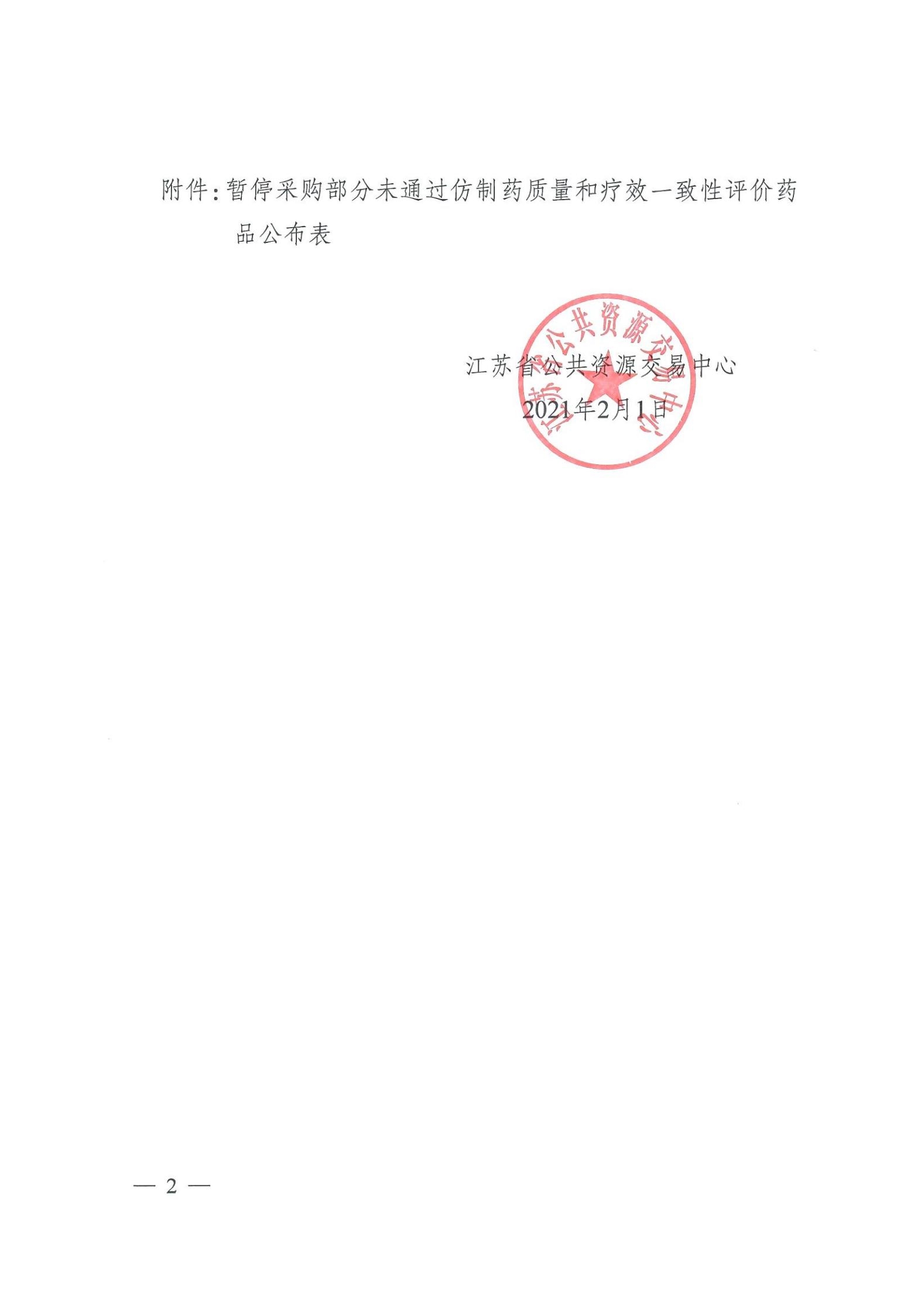 【江苏】2021江苏省公共资源交易中心关于暂停采购部分未通过仿制药质量和疗效一致性评价药品的通知 苏公易发[2021]19号