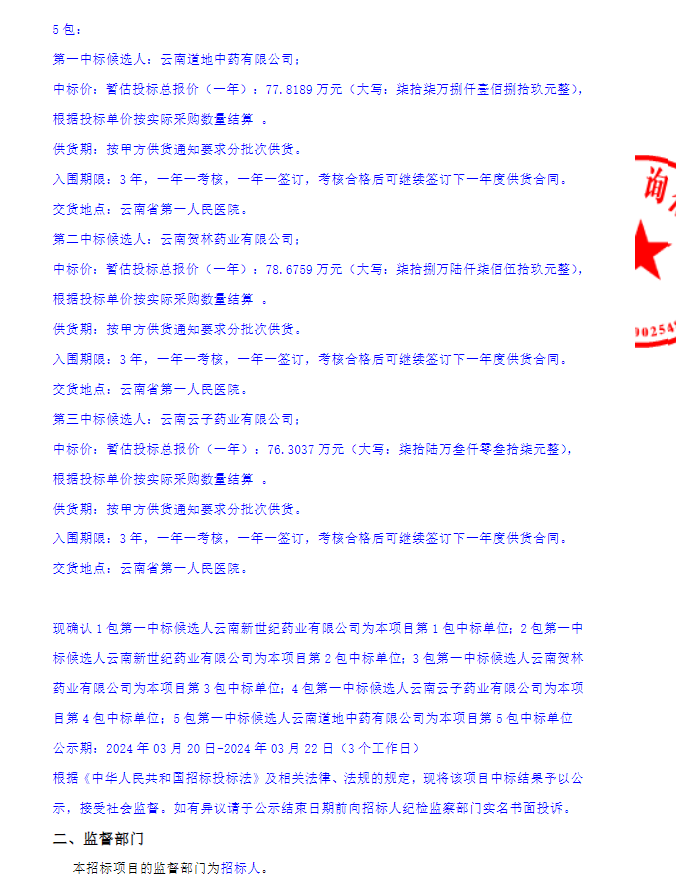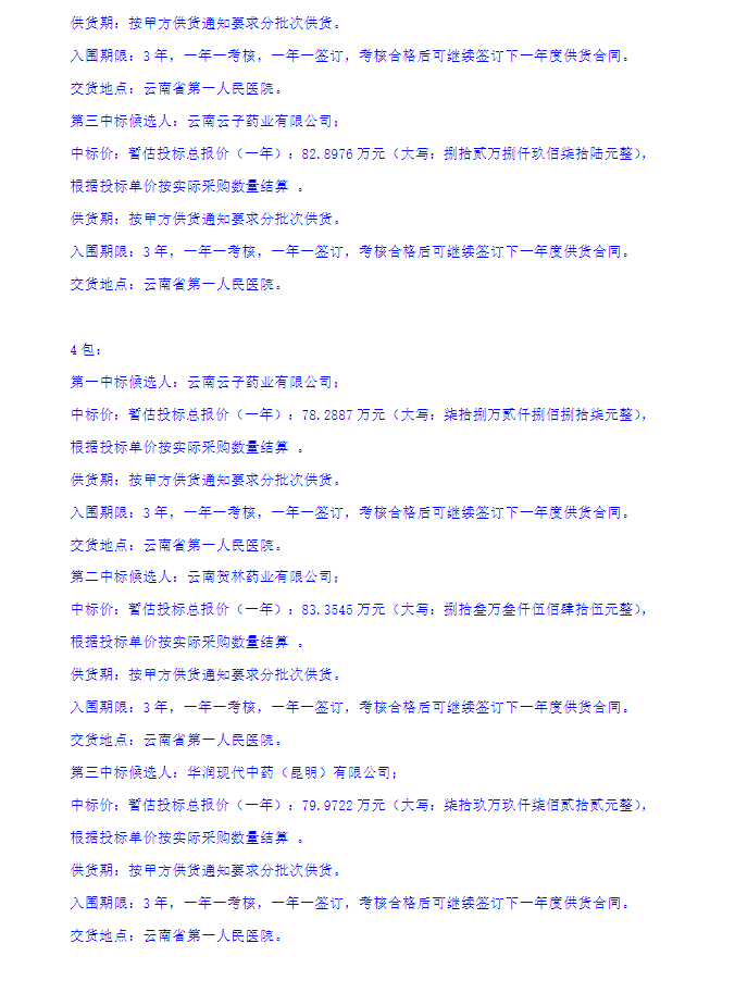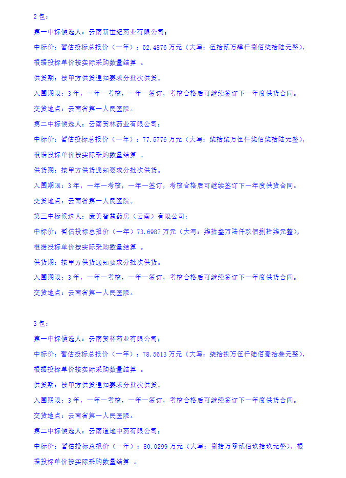 【云南省第一人民医院】云南省第一人民医院中药饮片三年期供货供应商招标项目(第1-5包)中标公示变更