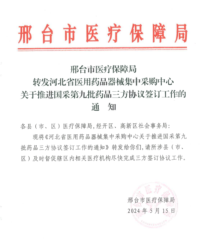 【邢台】邢台市医疗保障局转发河北省医用药品器械集中采购中心关于推进国采第九批药品三方协议签订工作的通知