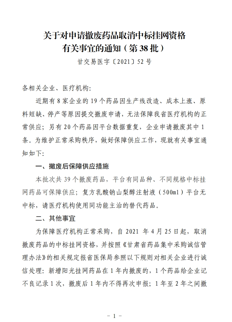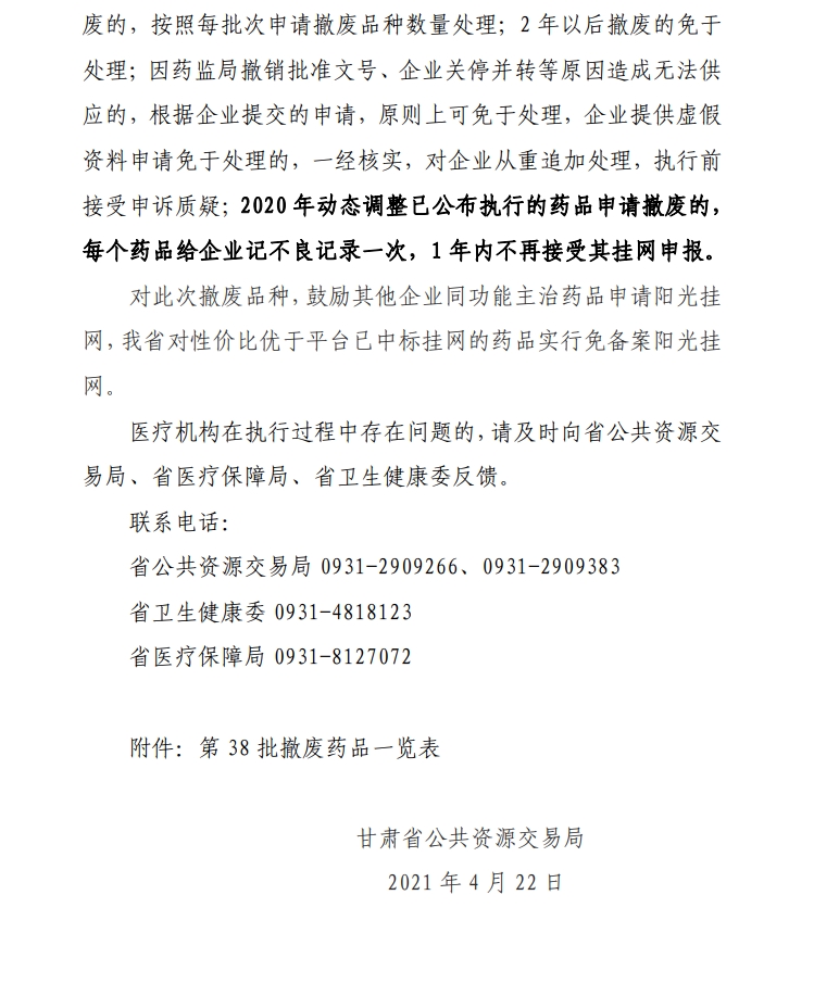 【甘肃】甘肃省关于对申请撤废药品取消中标挂网资格有关事宜的通知(第38批)