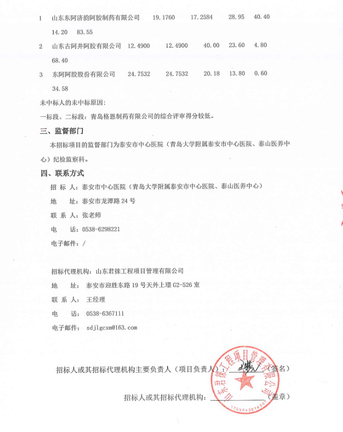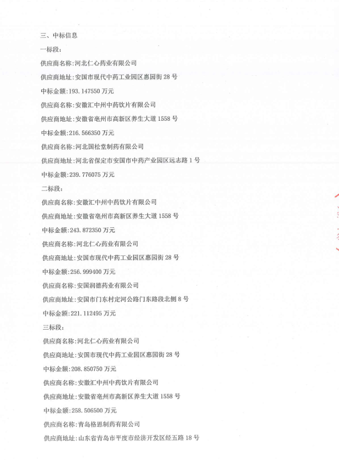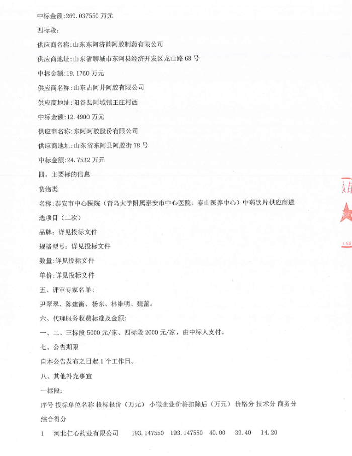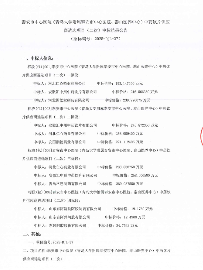 【泰安市中心医院】山东省泰安市中心医院(青岛大学附属泰安市中心医院、泰山医养中心)中药饮片供应商遴选项目(二次)中标结果公告