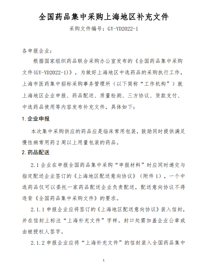 【上海】全国药品集中采购上海地区补充文件(采购文件编号:GY-YD2022-1)