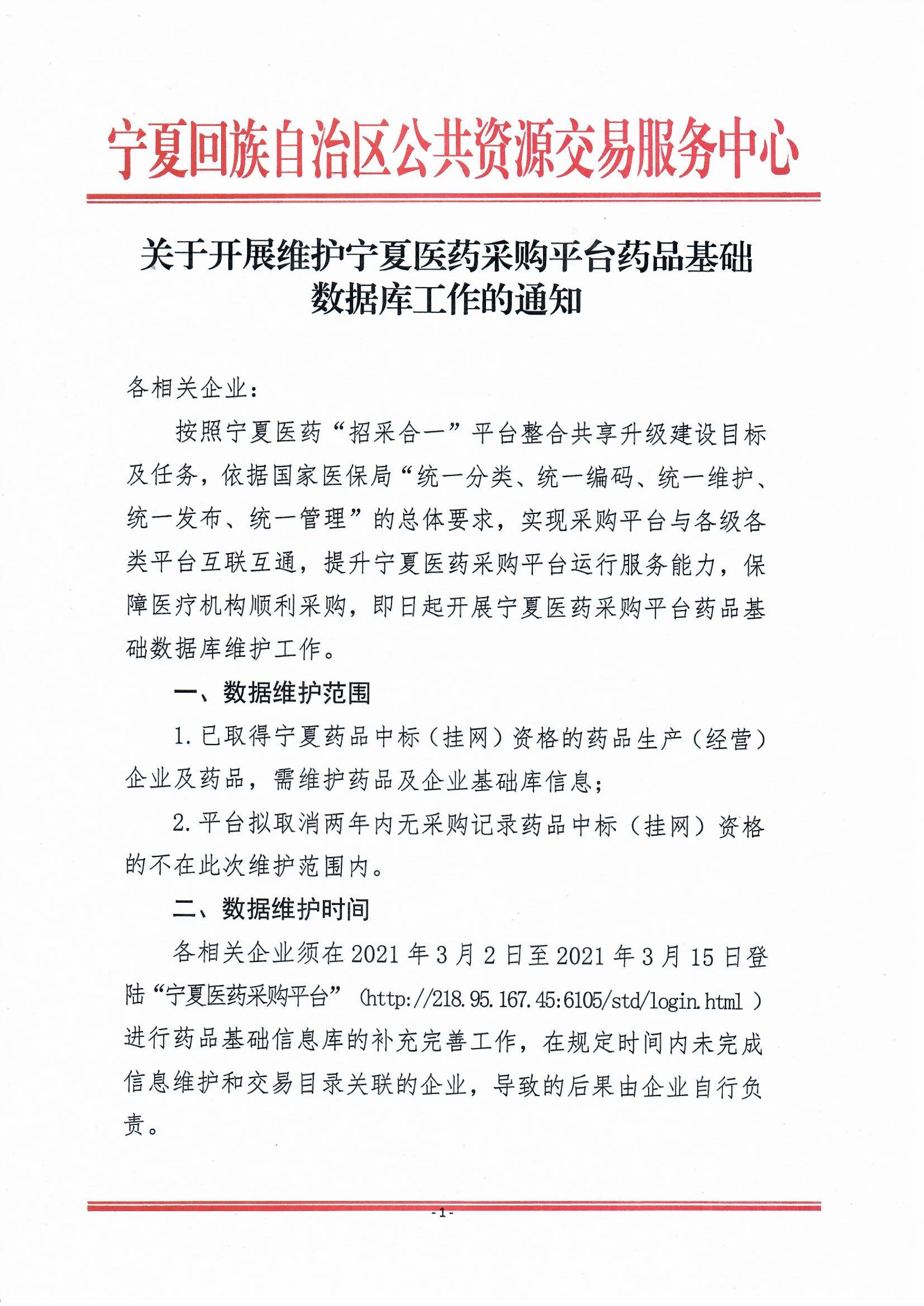 【宁夏】2021年宁夏自治区关于开展维护宁夏医药采购平台药品基础数据库工作的通知