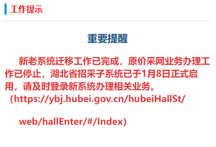 新老系统迁移工作已完成,原价采网业务办理工作已停止,湖北省招采子系统已于1月8日正式启用,请及时登录新系统办理相关业务。(https://ybj.hubei.gov.cn/hubeiHallSt/web/hallEnter/#/Index)