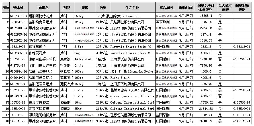 《关于做好前期国家谈判抗癌药品医保支付标准和采购价格调整的通知》(医保办发〔2018〕4号)公布的要求9月1日前降价的药品(简称“第一批”),具体涉及品规见下表。