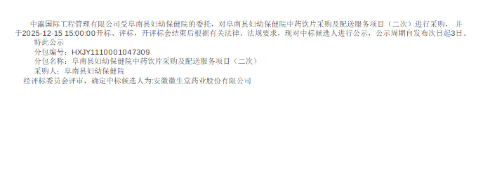 【阜阳市阜南县妇幼保健院】安徽省阜阳市阜南县妇幼保健院中药饮片采购及配送服务项目(二次)中标候选人公示