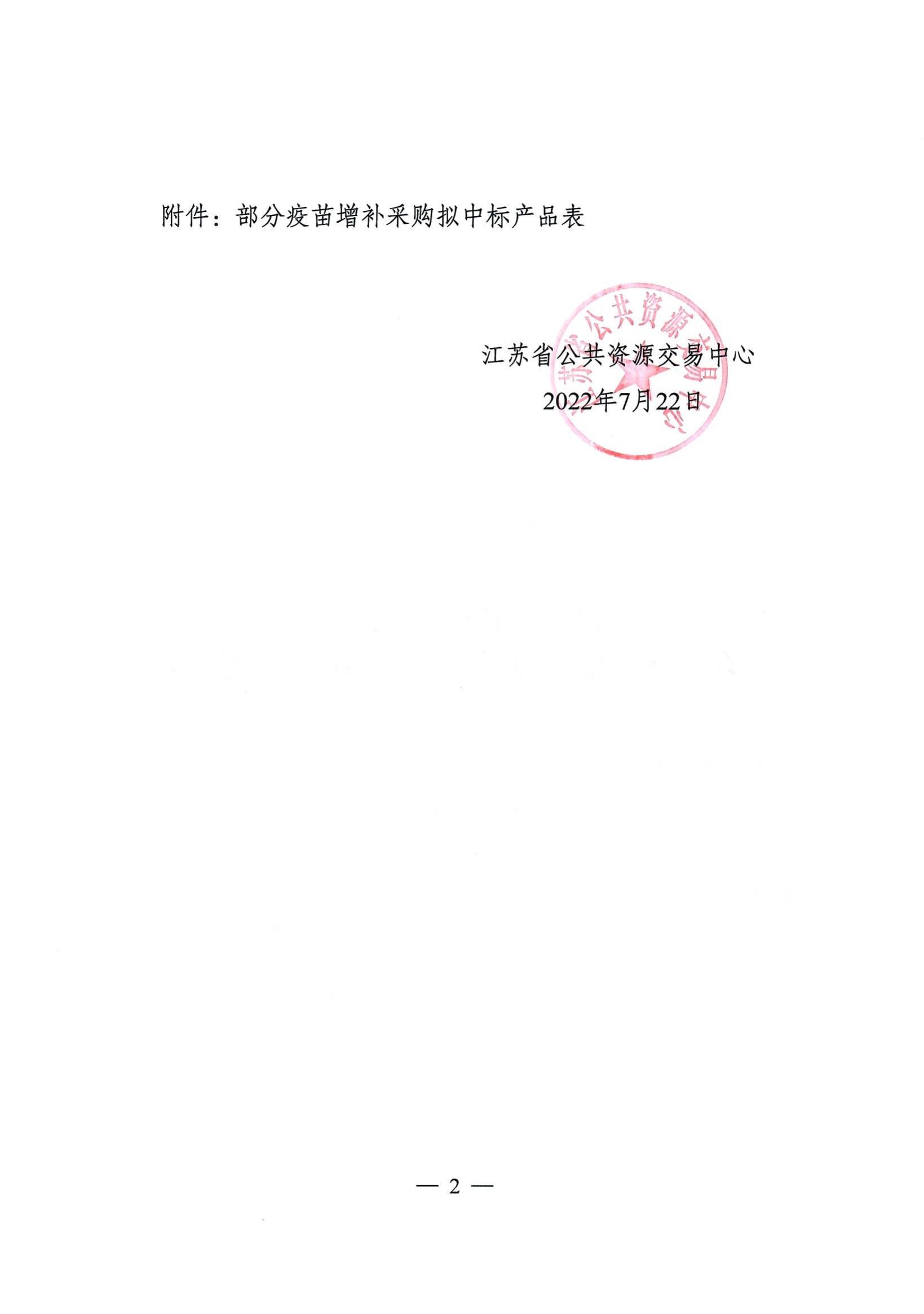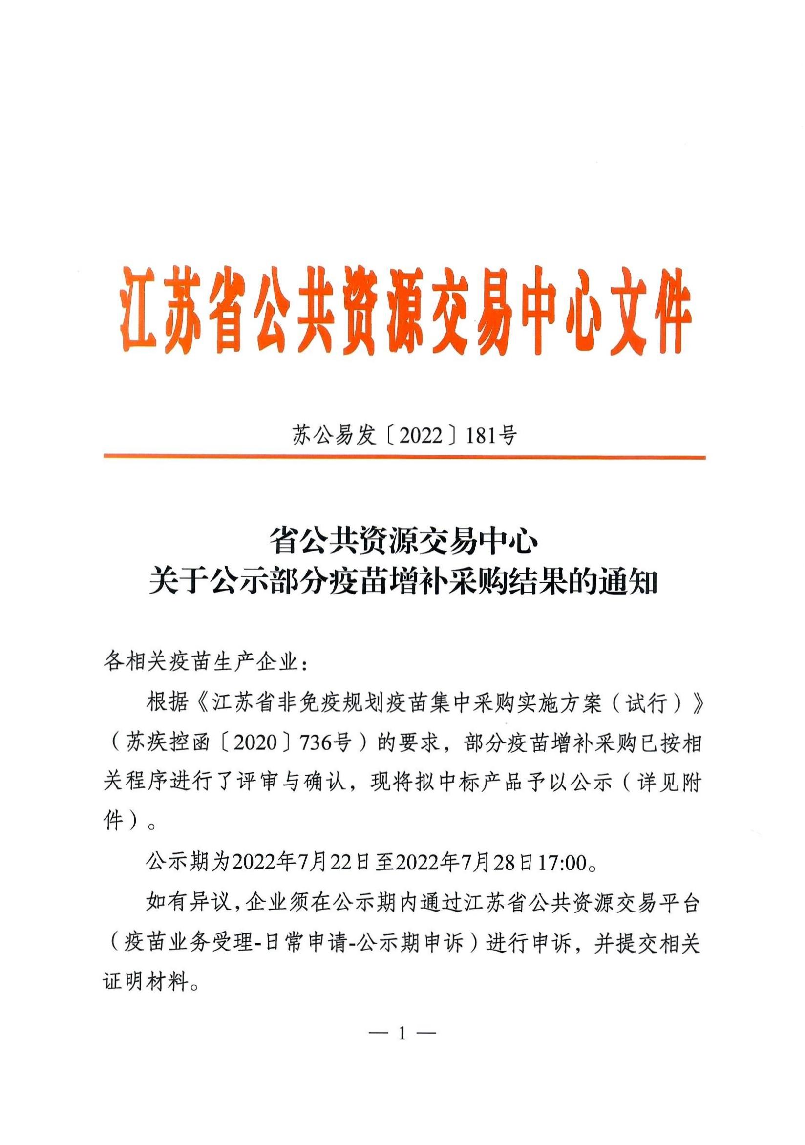 【江苏】省公共资源交易中心关于公示部分疫苗增补采购结果的通知