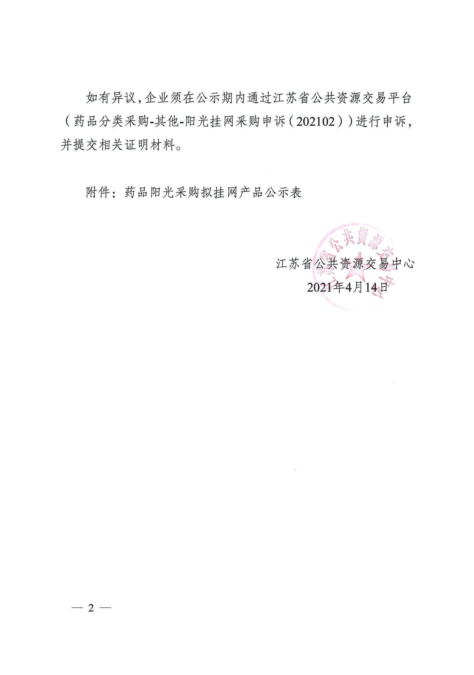 【江苏】2021年江苏省公共资源交易中心关于公示药品阳光采购拟挂网产品的通知 苏公易发[2021]56号