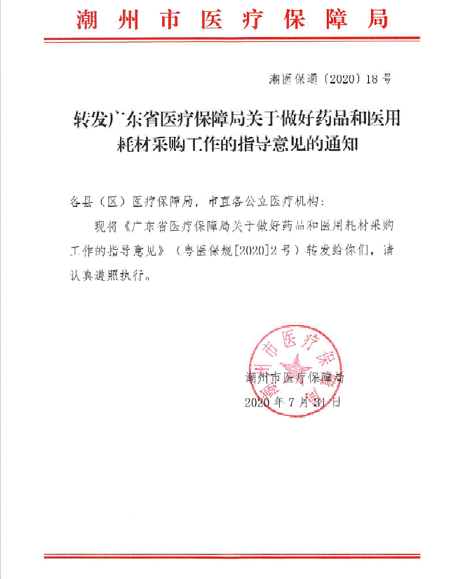 【潮州】广东省潮州市转发广东省医疗保障局关于做好药品和医用耗材采购工作的指导意见的通知