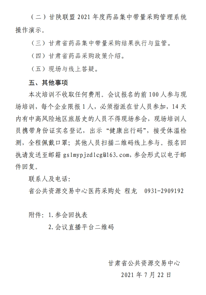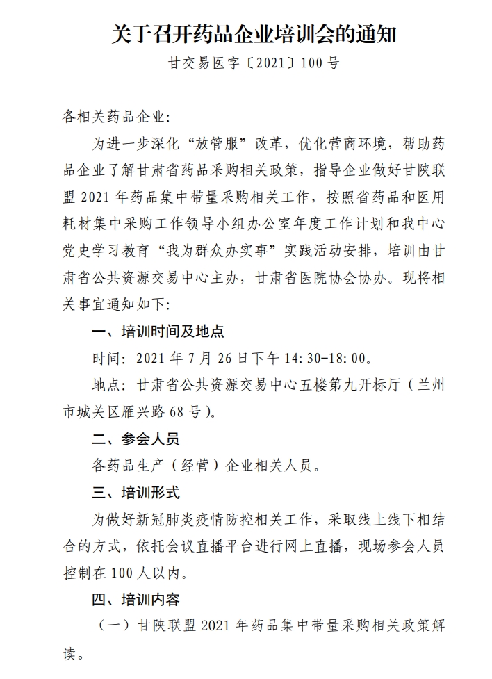 【甘肃】甘肃省关于召开药品企业培训会的通知(20210722)