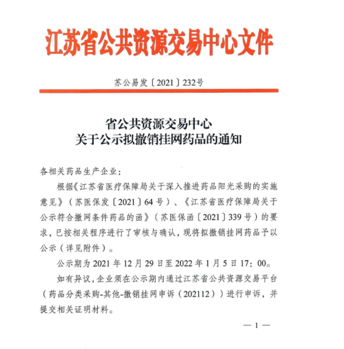 【江苏】江苏省公共资源交易中心关于公示拟撤销挂网药品的通知(20211229)
