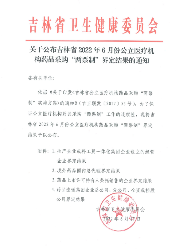 【吉林】关于公布吉林省2022年6月份公立医疗机构药品采购“两票制”界定结果的通知