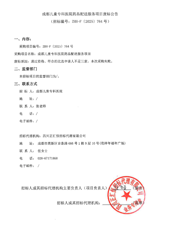 【成都儿童专科医院】四川省成都儿童专科医院药品配送服务项目废标公告
