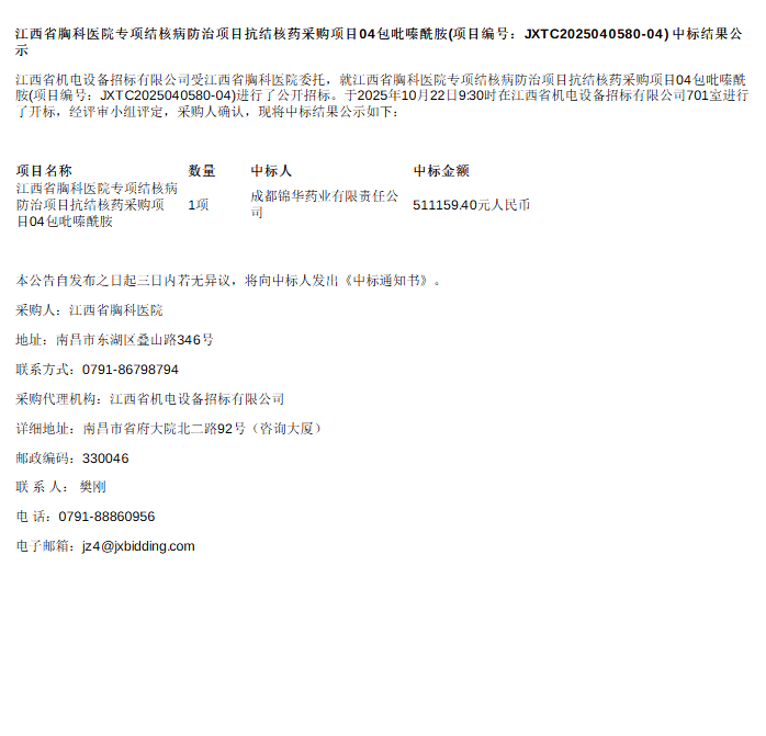【江西省胸科医院】江西省胸科医院专项结核病防治项目抗结核药采购项目04包吡嗪酰胺(项目编号:JXTC2025040580-04) 中标结果公示