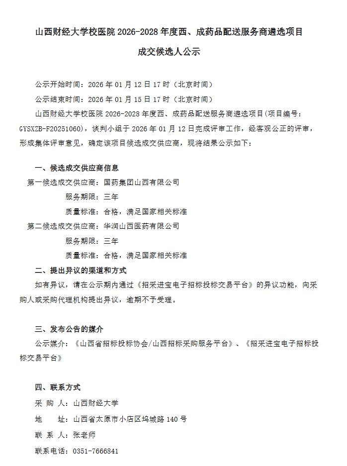 【山西财经大学校医院】山西财经大学校医院2026-2028年度西、成药品配送服务商遴选项目成交候选人公示