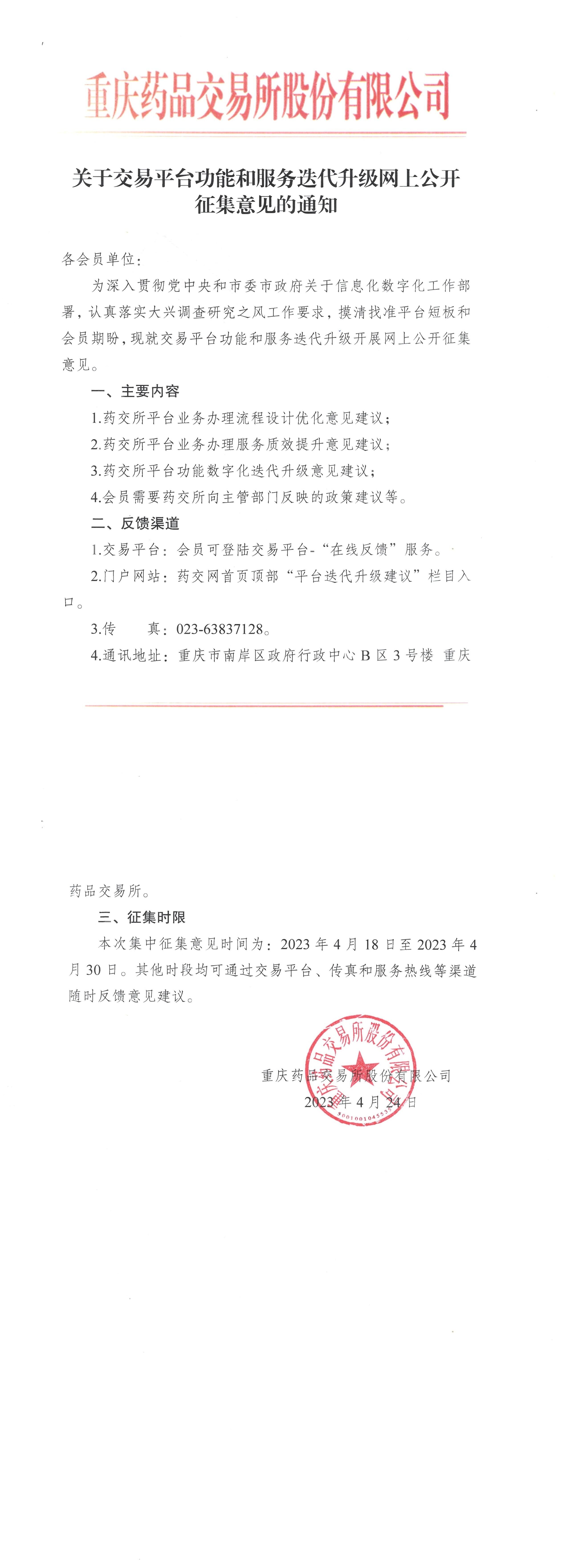 各会员单位: 为深入贯彻关于信息化数字化工作部署,认真落实大兴调查研究之风工作要求,摸清找准平台短板和会员期盼,现就交易平台功能和服务迭代升级开展网上公开征集意见。 征集意见渠道与方式详见附件《重庆药品交易所关于交易平台功能和服务迭代升级网上公开征集意见的通知》。