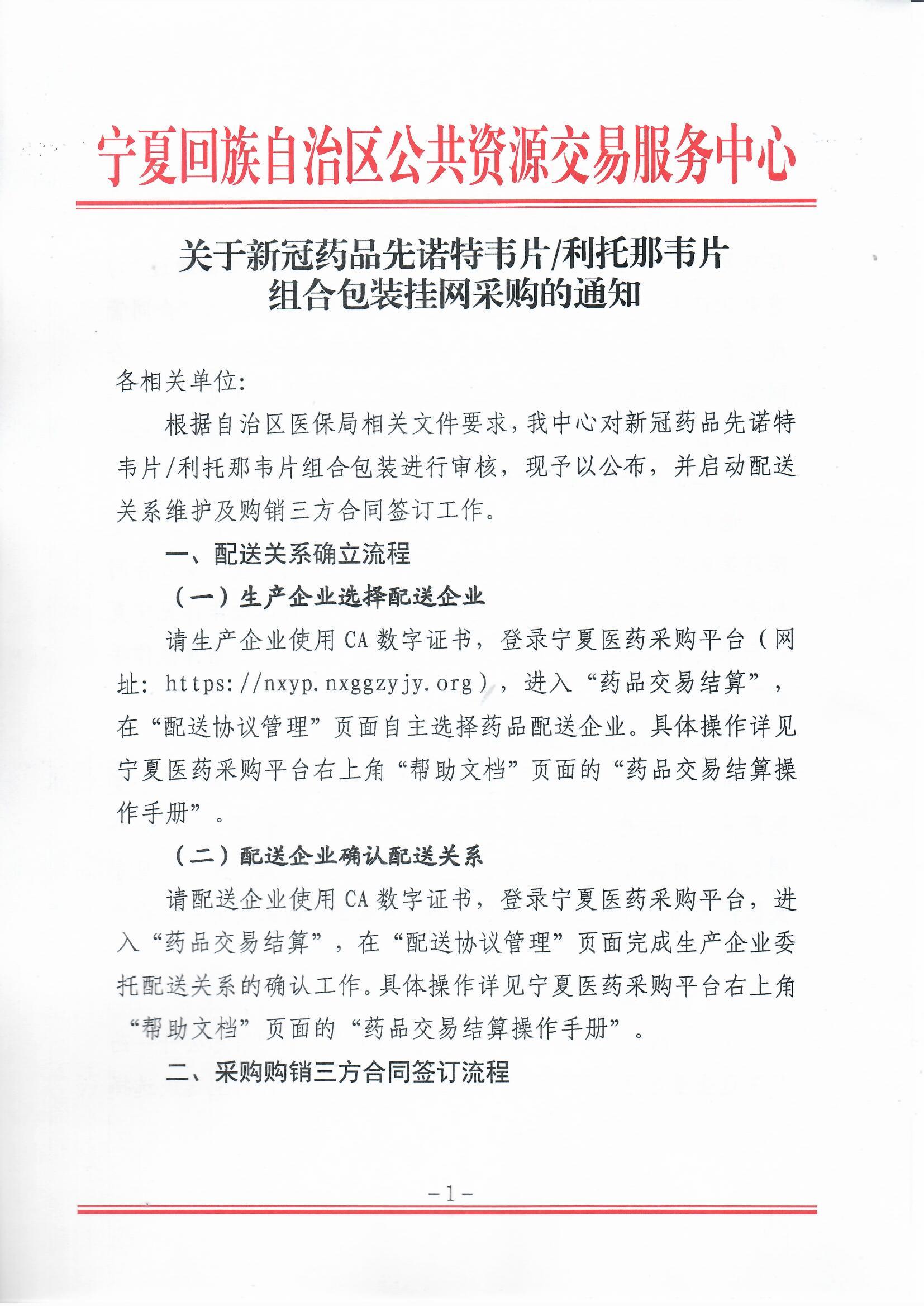 根据自治区医保局相关文件要求,我中心对新冠药品先诺特韦片/利托那韦片组合包装进行审核,现予以公布,并启动配送关系维护及购销三方合同签订工作。