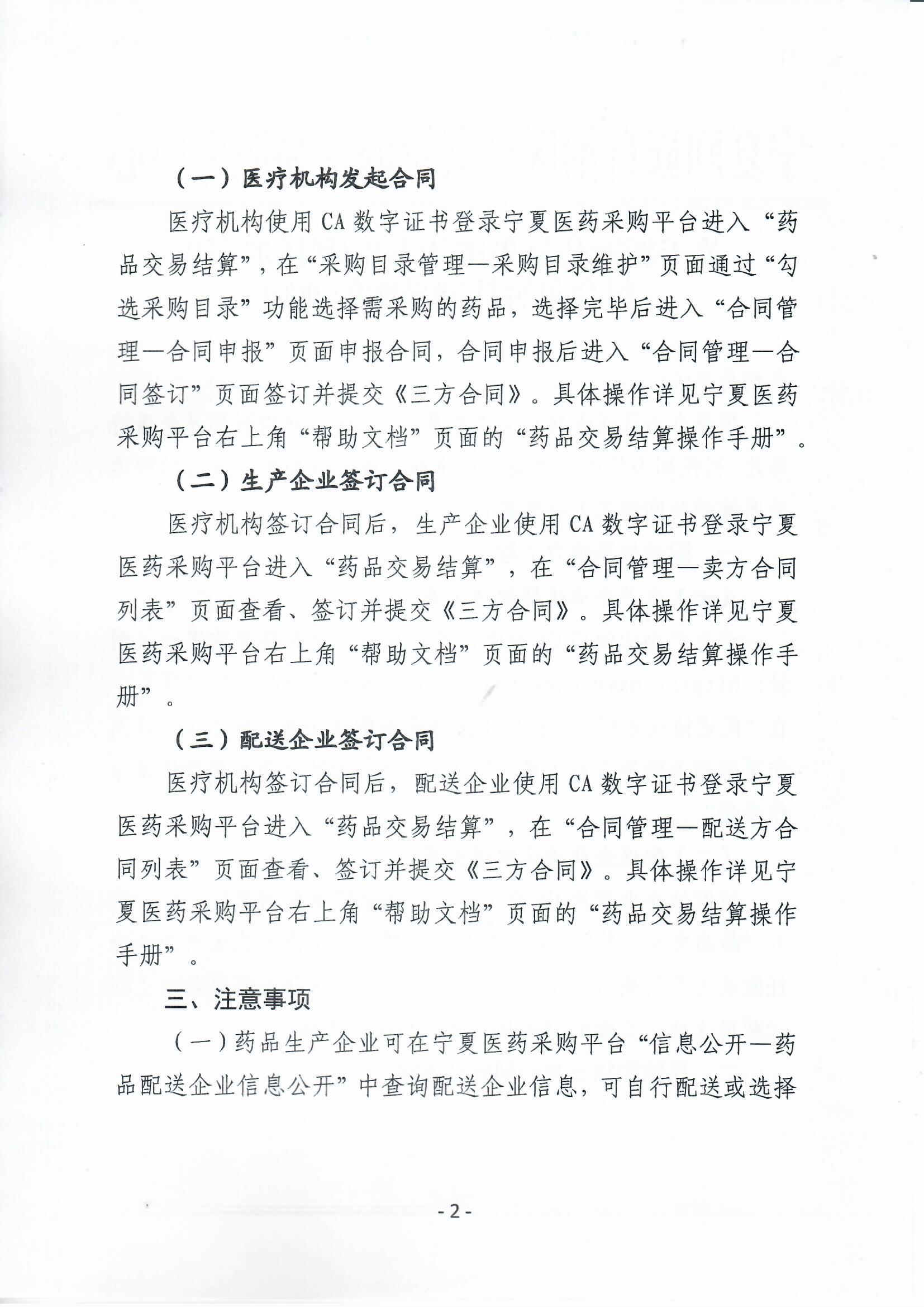 医疗机构签订合同后,生产企业使用CA数字证书登录宁夏医药采购平台进入“药品交易结算”,在“合同管理一卖方合同列表"页面查看、签订并提交《三方合同》。具体操作详见宁夏医药采购平台右上角“帮助文档”页面的“药品交易结算操作手册”。