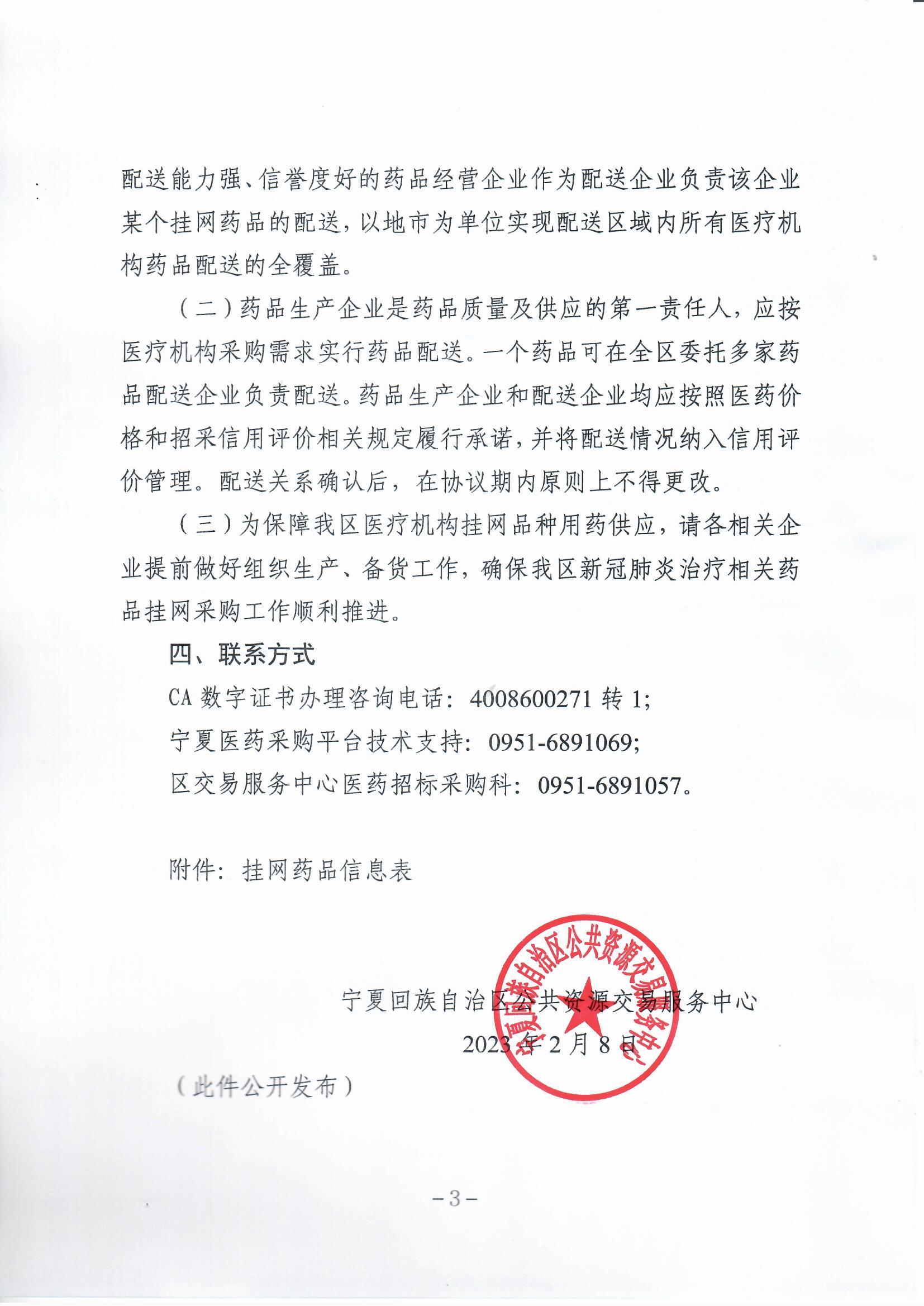 (三)为保障我区医疗机构挂网品种用药供应,请各相关企业提前做好组织生产、备货工作,确保我区新冠肺炎治疗相关药品挂网采购工作顺利推进。