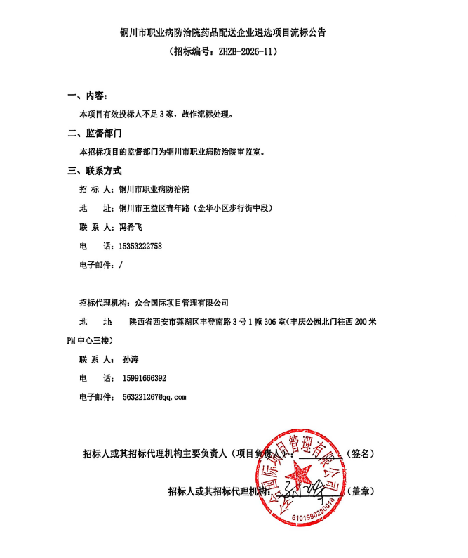 【铜川市职业病防治院】陕西省铜川市职业病防治院药品配送企业遴选项目流标公告