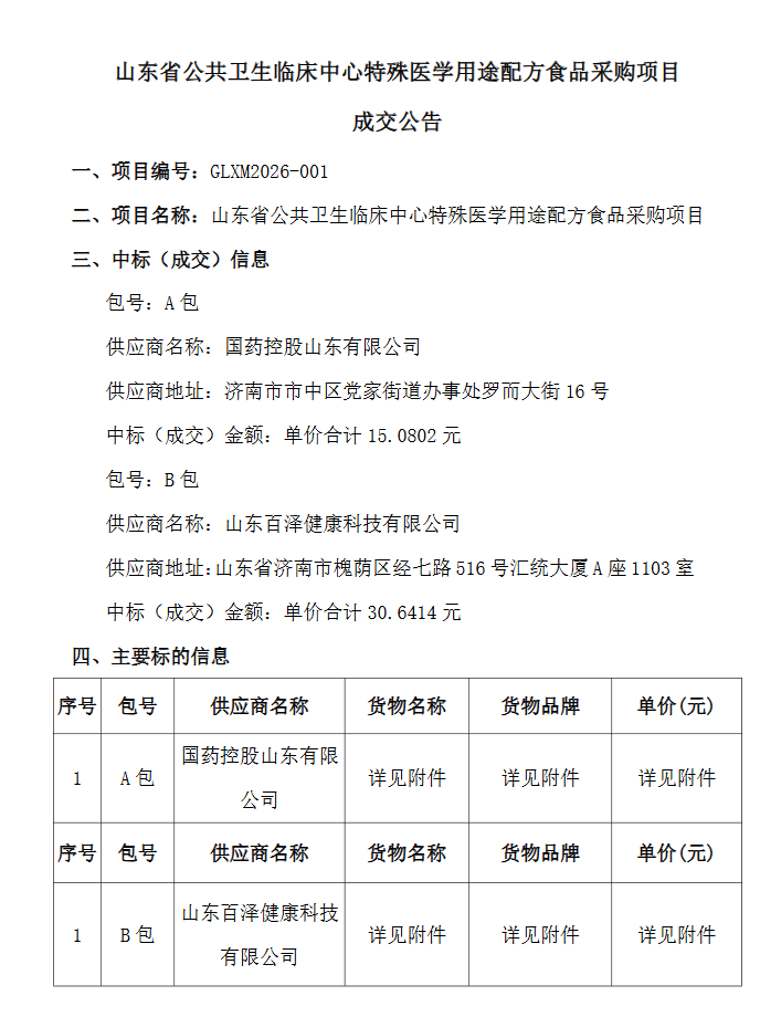 【山东省公共卫生临床中心】山东省公共卫生临床中心特殊医学用途配方食品采购项目成交公告