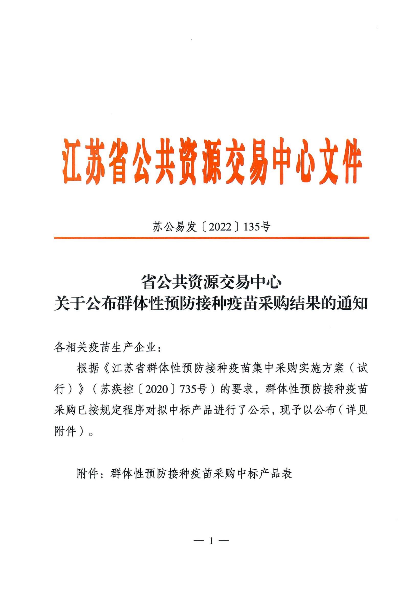 【江苏】江苏省公共资源交易中心关于公布群体性预防接种疫苗采购结果的通知(20220602)