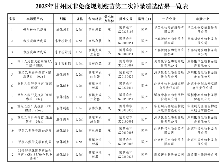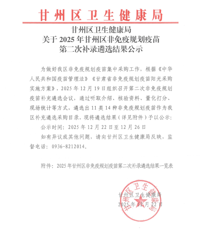 【张掖】甘州区卫生健康局关于2025年甘州区非免疫规划疫苗第二次补录遴选结果公示