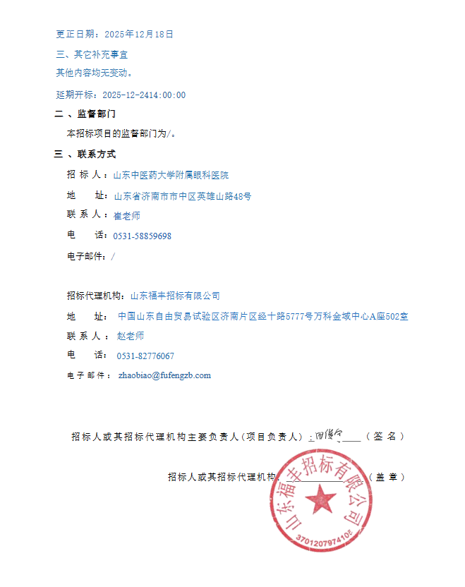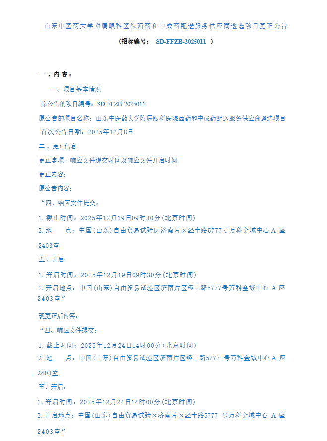 【山东中医药大学附属眼科医院】山东中医药大学附属眼科医院西药和中成药配送服务供应商遴选项目更正公告(20251218)
