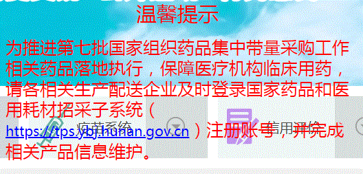 为推进第七批国家组织药品集中带量采购工作相关药品落地执行,保障医疗机构临床用药,请各相关生产配送企业及时登录国家药品和医用耗材招采子系统( https://tps.ybj.hunan.gov.cn)注册账号,并完成相关产品信息维护。