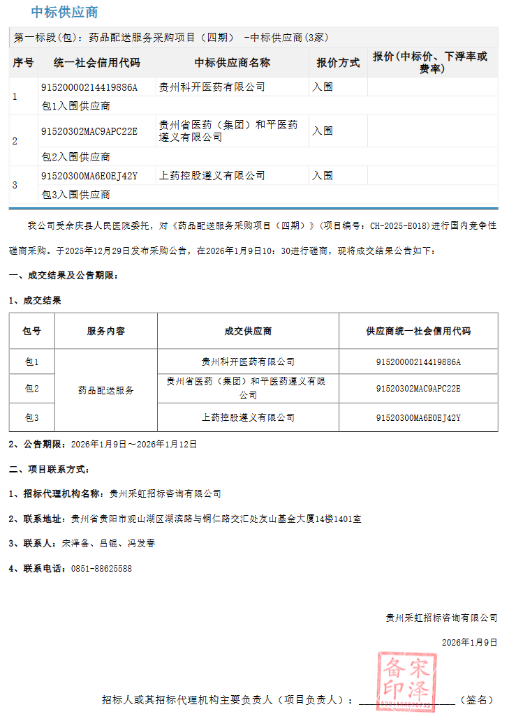 【遵义市余庆县人民医院】贵州省遵义市余庆县人民医院药品配送服务采购项目(四期)成交(结果)公告