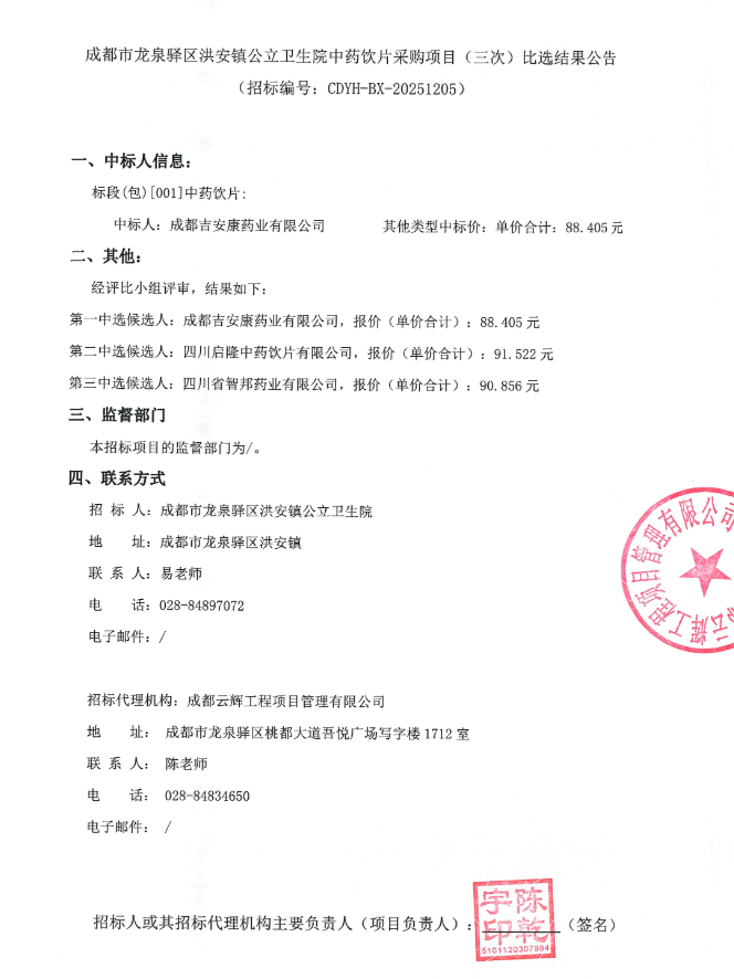【成都市龙泉驿区洪安镇公立卫生院】四川省成都市龙泉驿区洪安镇公立卫生院中药饮片采购项目(三次)比选结果公告