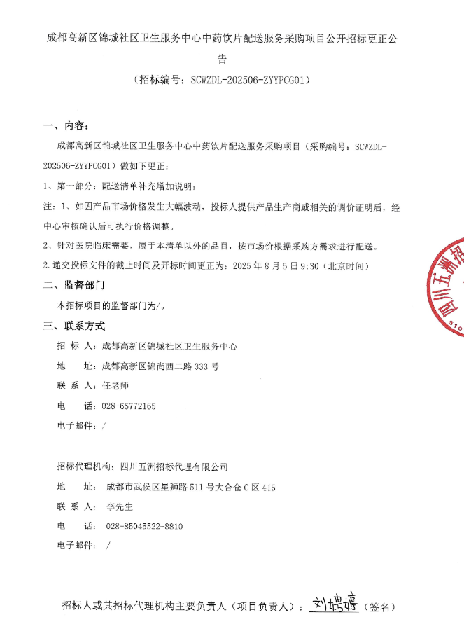 【成都高新区锦城社区卫生服务中心】四川省成都高新区锦城社区卫生服务中心中药饮片配送服务采购项目公开招标更正公告1