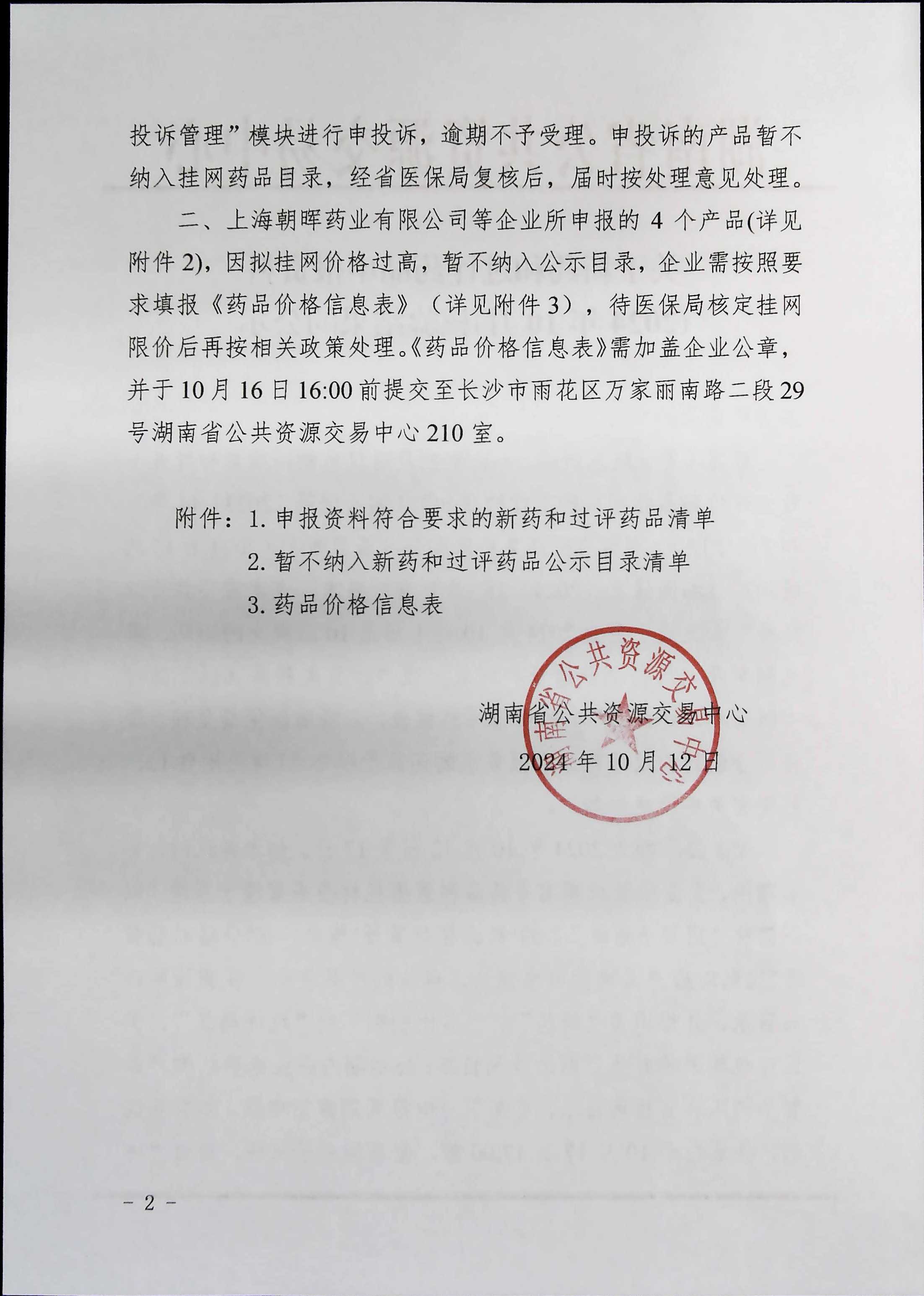 二、上海朝晖药业有限公司等企业所申报的4个产品(详见附件2),因拟挂网价格过高,暂不纳入公示目录,企业需按照要求填报《药品价格信息表》(详见附件3),待医保局核定挂网限价后再按相关政策处理。《药品价格信息表》需加盖企业公章,并于10月16日16:00前提交至长沙市雨花区万家丽南路二段29号湖南省公共资源交易中心210室。