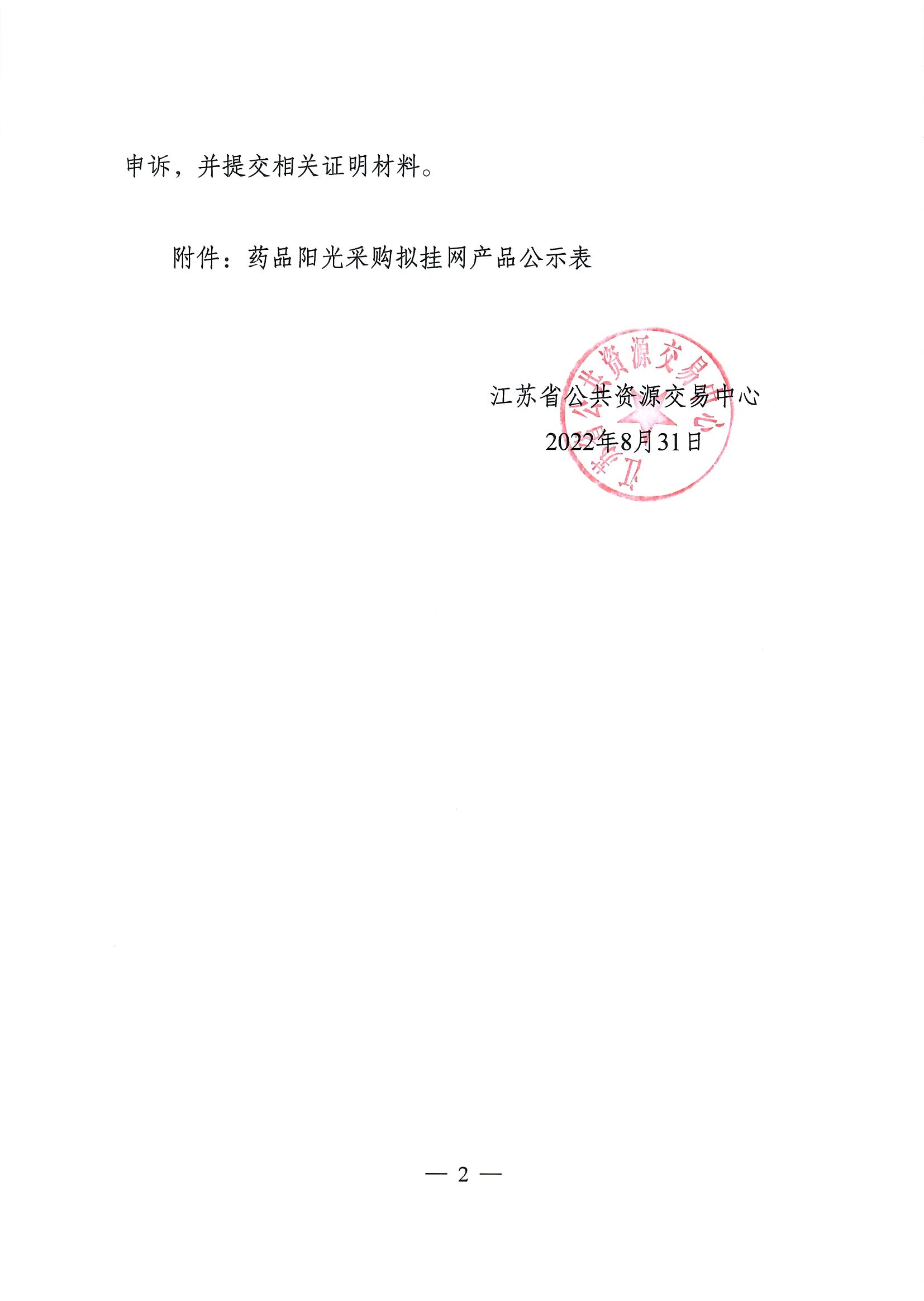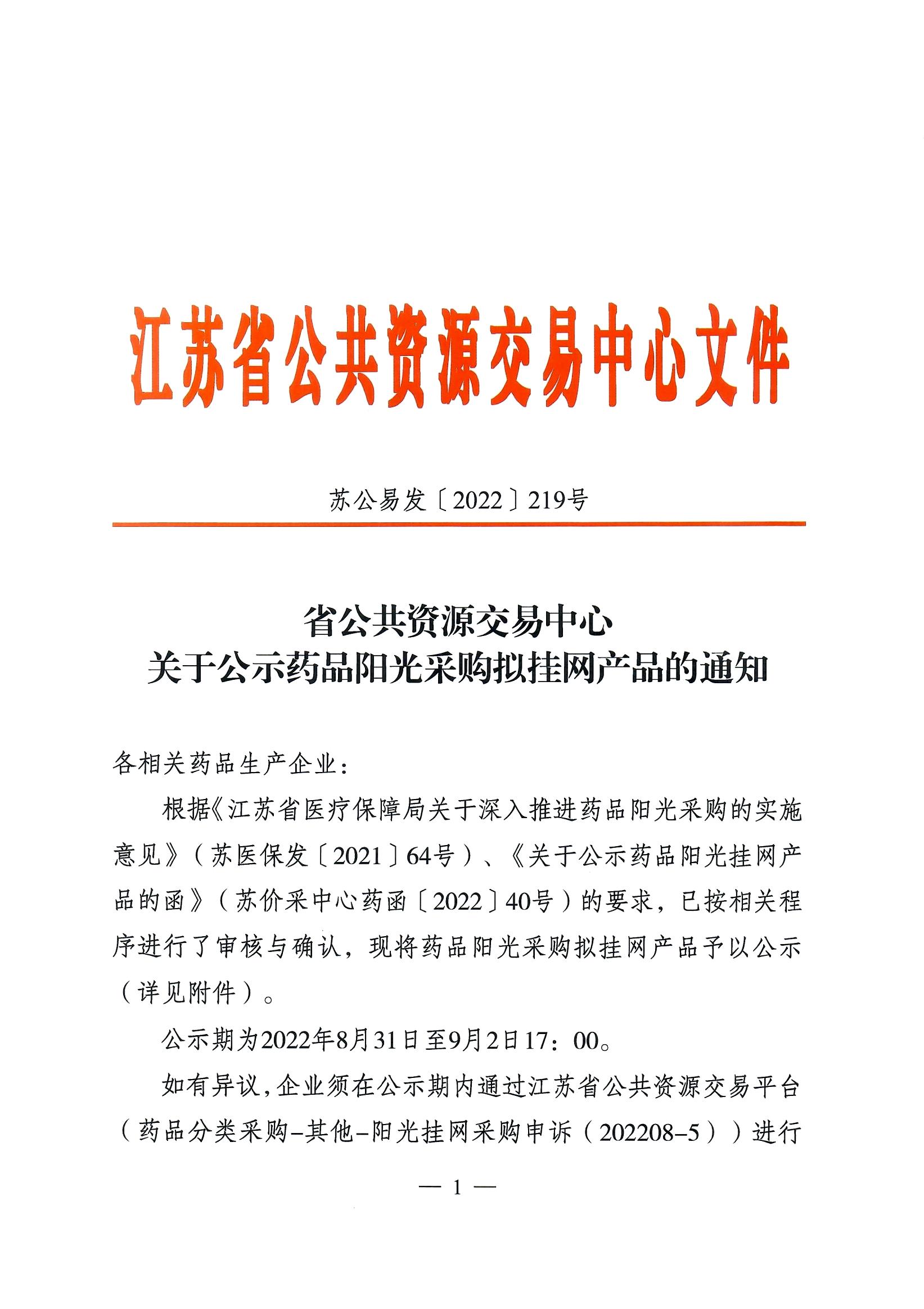 【江苏】江苏省公共资源交易中心关于公示药品阳光采购拟挂网产品的通知(20220831)
