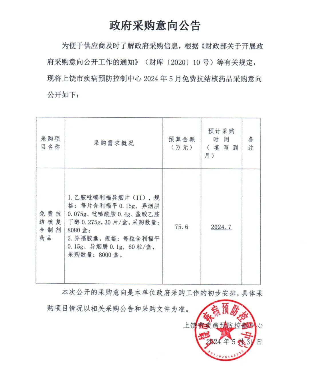 【上饶市疾病预防控制中心】江西省上饶市免费抗结核复合制剂药品采购意向公告