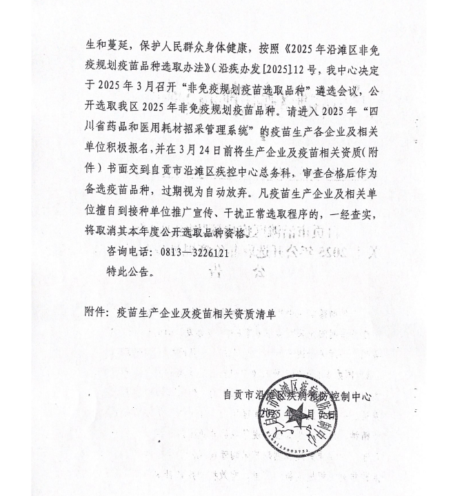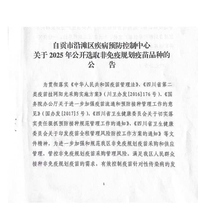 【自贡】自贡市沿滩区疾病预防控制中心关于2025年公开选取非免疫规划疫苗品种的公告