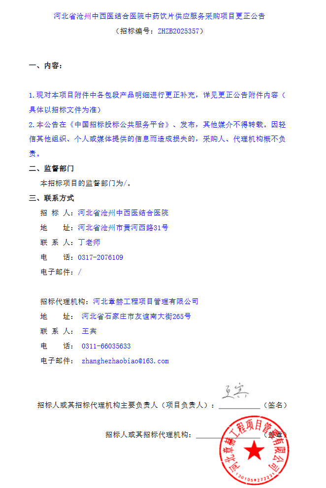 【沧州中西医结合医院】河北省沧州中西医结合医院中药饮片供应服务采购项目更正公告